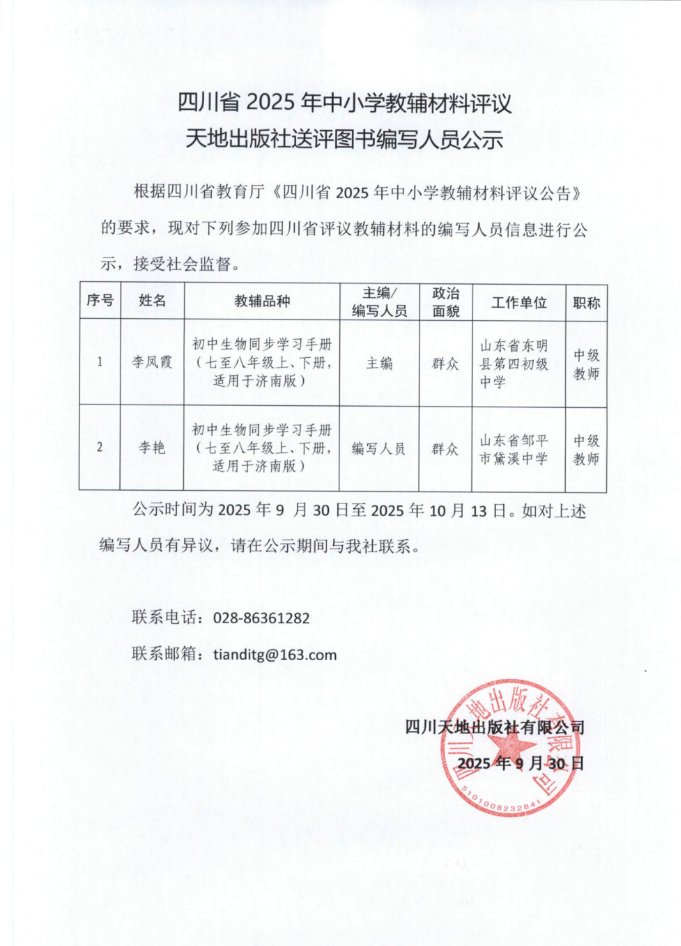 四川省2025年中小学教辅材料评议天地出版社送评图书编写人员公示(三)