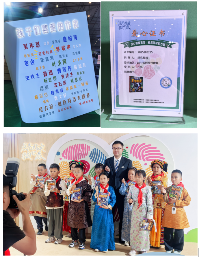 10月17日,2025天府书展现场,由中央宣传部印刷发行局、中共四川省委宣传部主办的“点亮阅读微心愿”圆梦起航行动圆满举办。天地出版社重要作家“坦克叔叔”耿溧受邀出席,与作家王蒙,中国作协副主席、四川省作家协会主席阿来,以及同样深受孩子们喜爱的儿童文学作家杨红樱等文化名人,携手6位读者启动了“点亮阅读微心愿”网络平台小程序,共同为全国17个省份6.6万余名农村少年儿童的阅读心愿注入力量,以优质读物搭建起城乡阅读沟通的桥梁。